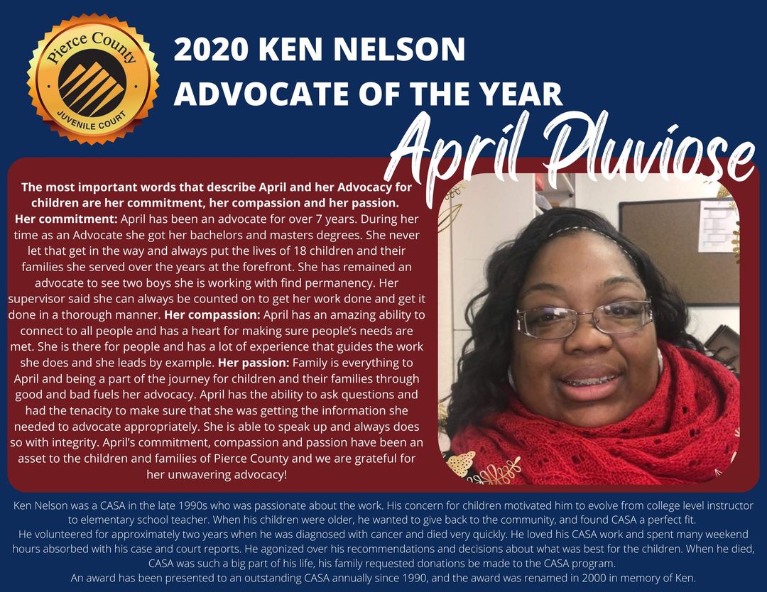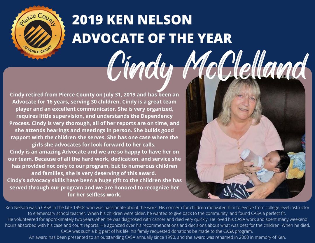 Retired Judge Kathryn Nelson told us of her late husband's love of his work as an Advocate, working diligently on his reports, writing and rewriting. This led to her deep appreciation of the roles we play in the system, when she became a judge. She presented the award for the Ken Nelson Advocate of the Year to Amy Frazier. Also recognized were the Advocates of the years for 2019 (Cindy McClelland) and April Pluviose who had not received their awards in person.